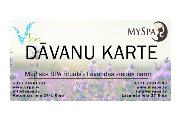 Lavandas rituāla burvība atspoguļosies Jūsu skaistumā un labsajūtā. Bagātīgā un lieliskā meistara pieredze palīdzēs atpūsties un pilnībā izbaudīt ekskluzīvo SPA procedūru lavandas aromāta laukā. Rituālā tiek izmantoti dabiskie produkti, kuru pamatā ir lavandas ziedi. Tie maģiski un dziedinoši ietekmēs Jūsu ķermeni un dvēseli, bet degošās sveces un dienvidu valstu mistiskā mūzika pastiprinās šo efektu ar gaismas un skaņas harmoniju. Tas ir SPA rituāls, kas palīdzēs Jums atpūsties no ikdienas kņadas un pacels Jūs virs ikdienas, paverot jaunus augstumus. Procedūrā ietilpst: ✓ Relaksējoša visa ķermeņa masāža ✓ Eko pīlings visam ķermenim ar lavandas skrubi ✓ Ietīšana lavandas maskā ✓ Galvas masāža ✓ Dāvaniņa no salona ✓ Karsta tēja vai kafija Paredzēta 2 personām Ilgums - 120min