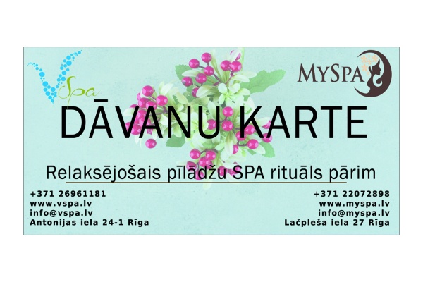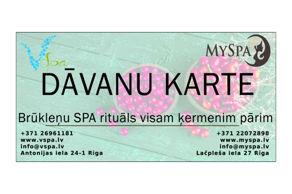 Izbaudi brūkleņu SPA rituāla dabisko enerģiju! Vitamīnu avots ar patīkamu saldi rūgtu garšu piepildīs Jūsu ķermeni ar dabas spēkiem. Brūklenes ir dziedinošs, atsvaidzinošs un tonizējošs līdzeklis, kas nodrošina Jūsu organismu ar pilnu vitamīnu kompleksu. Brūkleņu SPA rituālā ietilpst dabīgā kosmētika ar augļu skābēm. Šis rituāls nodrošinās Jums brīnišķīgu labsajūtu, vieglumu, harmoniju ar sevi un neaizmirstamu atpūtu! Procedūrā ietilpst: ✓ Relaksējoša ķermeņa masāža ar brūkleņu losjonu ✓ Brūkleņu pīlings rokām un kājām ✓ Galvas masāža ✓ Karsta tēja / kafija Paredzēta 2 personām Ilgums - 75min