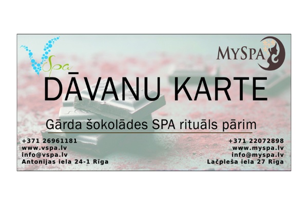 Šokolādes SPA - tas ir pasakinais prieks Jūsu ķermenim un prātam! To apmeklējums - tā ir reta iespēja atzīties mīlestībā savam ķermenim un izbaudīt maigo, romantisko atmosfēru. Procedūras gaitā tiek izmantota dabīga šokolāde. Tās burvīgais aromāts kopā ar maigo sveču mirdzumu un romantisko mūziku dos Jums enerģiju uz ilgu laiku! Šī procedūra iekļauj sevī maigu galvas masāžu, kā arī relaksējošo ķermeņa masāžu, kura tiek veikta ar vieglām slīdošām kustībām. Pēc masāžas tiek veikta ietīšanas procedūra šokolādē. Lielisks veids, kā atpūsties un palutināt sevi, kā arī oriģinālā dāvana mīļotajai vai labākai draudzenei! Procedūrā ietilpst: ✓ Ķermeņa atslabinošā šokolādes masāža ✓ Ķermeņa ietīšana ar šokolādes plikācijām ✓ Tēja/ Kafija Paredzēta 2 personām Ilgums - 60min