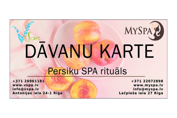 SPA procedūra un rituāls Jūsu skaistumam! Jūs sagaida pilnīga relaksācija, dzīvesprieka uzlabošanās, kā arī fiziskās un emocionālās spriedzes novēršana. Sulīgs persiku aromāts liks Jums justies, kā augļu vasaras dārzā. Rituālā tiek izmantoti augstas kvalitātes produkti ar dabīgo persiku ekstraktu. Procedūrā ietilpst: ✓ Visa ķermeņa masāža ✓ Visa ķermeņa pīlings ✓ Ietīšana persiku maskā Paredzēta 2 personām Ilgums - 120min