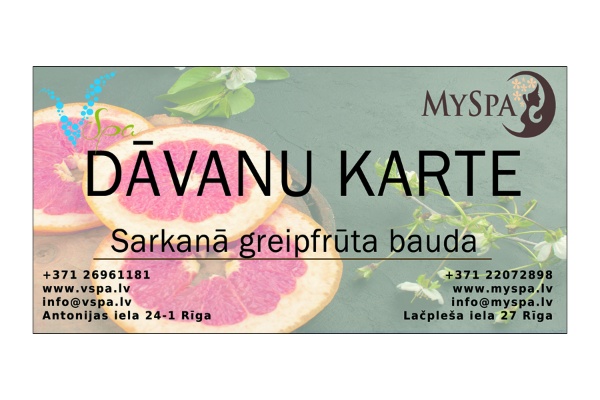 Iegūstiet neaizmirstamu baudu no masāžas ar siltu greipfrūtu ēterisko eļļu! Jūs tūlītēji izjutīsiet sildošo relaksāciju un nervu nomierinošo efektu, kas ļaus Jums pilnībā iegremdēties izpriecu un saldo sajūtu pasaulē. Procedūrā ietilpst: ✓ Dziļi relaksējoša visa ķermeņa masāža ar greipfrūtu un apelsīnu ēteriskajām eļļām sveču gaismā ✓ Visa ķermeņa eko pilings ✓ Relaksējoša pēdu masāža ✓ Tēja vai kafija pēc procedūras Paredzēta 2 personām Ilgums - 90min